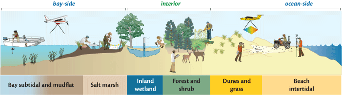 The table and diagram below show various types of monitoring activities that park staff do to track changes in the natural resources of Assateague Island. Drag your mouse over the diagram to read about each activity.